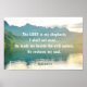 Den inspirerande citatteckenskriften poster ett vackert naturfoto av ett sjö omgivet av berg. Den innehåller en del av den älskade 23:e psalm verses 1-3: "LORD är min herde, jag vill inte... Han leder mig bredvid det stilla vatten. Han återställer min själ."