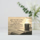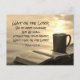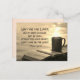 Vackra vykort för anpassningsbar visar en brinnande mugg av kaffe/te och en bibelvila på en räls som förbiser en gyllene kropp av vatten. Den har Bible Verse Psalm 27:14, vänta på Herren, var av bra mod och stärka ditt hjärta. Vänta, säger jag, på Herren!
