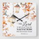 Väggklocka med inspirerande citattecken visar en höstfärgskonstruktion med fallande färgad löv runt hängande ljus. Det är en uppmuntrande bibelsallad 27:1, "Herren är mitt ljus och min räddning: vem ska jag vara rädd för?"