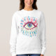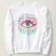 Trefaldig öga-tröja med en färgfull illustration av en konstig blå öga med stora glättade rosa-ögonfransar, ljusblå tårar som flödar överallt och många rosa och grönt inslag - utökning av ögonfransarna.