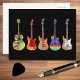 Elektriska, akustiska och semiakustiska gitarrer pryder detta funkiga psykedeliska vykort i levande popkonstfärger. Varje gitarrist eller musiker kommer att berätta för dig att man aldrig kan ha för många gitarrer. Detta roliga färgglada gitarr vykort firar energin och variationen hos detta underbara musikinstrument. Den perfekta presenten för gitarrister, musiker och musikälskare. Psychedelisk gitarr pop art av konstnären Catherine Sweetman