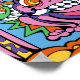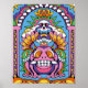 Denna mycket invecklade och vibrerande illustration av färgaden skildrar en fantastisk, staplad totemaliknande varelse eller varelse, rik med psykodelisk påverkan. På basen finns en stor, malande, grodliknande enhet i rosans och lilans nyck, med många ögon och ett stort, tohumant leende. Ovanför sitter ytterligare en mångögd abstrakt ansikte med ett framstående tredje öga, försedd med gult och rosa, som vågigt inslag som liknar fjädrar eller lågor. Det är ett stiliserat, vitt skalle som är inramat av taggiga, färgstarka strålar och snurrande moln. Hela sammansättningen ställs in i ett bågformigt ram med fet mönster med flera färgader mot en ljusblå bakgrund. Konsten stil påminner om 1960-talets konturkonst poster och folkkonst.