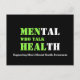 Ett motiverat MENTAL HEALTH POSTCARD som stöder manarnas psykiska hälsa och uppmuntrar manar att tala genom att komma i kontakt. På framsidan visas ord MENTAL HEALTH i kombination med MANAR WHO TALK HEAL. Det finns en underrubrik under platshållaren som är ANPASSADE, så du kan byta till namn i din kyrka eller organisation, osv. På motsatt sida finns det en vers från Ecclesiastes plus platshållarkontaktuppgifter, som är ANPASSADE, så att du kan anpassa dig till text som du själv väljer. Detta skulle göra det för manar (eller kvinnor) att tänka på motivation. Det är också idealiskt som favörer på konferenser i manar, eller som lämnas i pub, gym, kyrkor, kaffebutiker osv. Matchande objekt är tillgängliga.