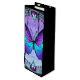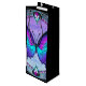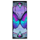 En pulserande fjäril med blå och lila centreras i en cirkulär form som omges av svårsmälta blommönster och dekorativa juveler. Den totala sammansättningen exuderar en nedfläckad glasestetik med en harmonisk blandning av färg och symmetri.