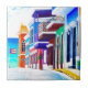 Målning av en gata i San Juan, Puerto Rico med den Puerto Rican flagga, de färgrika byggnaderna och växterna.