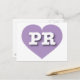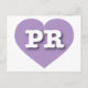 Det här vykortet har ett lavendelhjärta som innehåller det feta, vita, övre fodral brev PR, förkortningen officiell för Puerto Rico, den hätska iseln. Baksidan av vykortet är tom i väntan på dina handskrivna känslor eller personlig. Välj teckensnitt stil, storlek och färg.