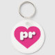 Den här nyckelkedjan har ett dynamiskt shock rosa-hjärta som innehåller fet, rundad, vit nedre fodral brev pr, en lekfull version av förkortningen för Puerto Rico, den tilltalade ön.