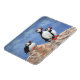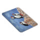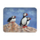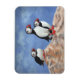En gouacher illustration av tre puffins som trycktes på ett klippigt klipp, mot ett vibrerande blå himmel.