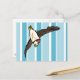 En lustig tecknad illustration av en söt puffin med en stickad ullhatt. Pistor som är stripi med en pom och band. Bakgrunden är ett trendig blått och vitt rand mönster. Om du vill ha hjälp med att anpassa den här designen kan du kontakta mig genom att fråga den här designern, precis under den här texten eller via min webbplats www.tiki.graphics