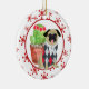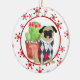 På framsidan av denna Helgdag är ornament en söt svart och brunt med en diamant mönster röd och grått väst. Förutom honom är en grönt med röda blommar. Bilder placeras på en vit oval som är inramad av en retro röd snöflinga mönster. Baksidan av dekoratet har samma bakgrund och ovaler med anpassningsbarna i två fält. Cute! *Tack till Winchester Lambourne för hund i den här designen.