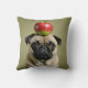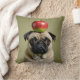 Lustigt Pug med äppelbalansering ovanpå hans huvud.