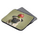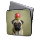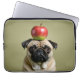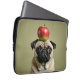 Lustigt Pug med äppelbalansering ovanpå hans huvud.