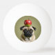 Lustigt Pug med äppelbalansering ovanpå hans huvud.