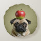 Lustigt Pug med äppelbalansering ovanpå hans huvud.