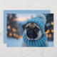 Det här vackra julkortet har en söt pug med mysigt blå sticka-hatt och scarf, som står mot en bakgrund av det dubbla ljus och ett snöslandskap. Denna hjärtslitande bild är perfekten för att sprida helgdag och ge ansikte ett leende av både hundälskare och julentusiaster.