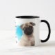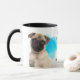 En porträtt av en förtjusande Pug-Hund finns på två sidor av mugg. Varje bild placeras på en ljusblå spatterbakgrund. Mellan två bilder finns texten som beskriver denna lojala och kärleksfulla följeslagare, med "PUG-hund" svart i grund. All text är lätt att anpassa till vad du vill, så att du kan beskriva din egen lojala vän.