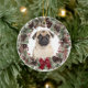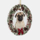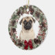 På framsidan av denna Helgdag är ornament en bild av en vacker pug som ramas av en söt vattenfärgskon gräs och berrys Helgdag. Hund är i mitten på en vit bakgrund. En glansig röd buske ge lite av julens gnistra till andedräkten. Baksidan av dekoratet har samma andedräkt med anpassningsbarnas text i rött och mörk grönt.