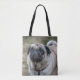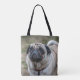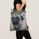 Ett vackert foto av en söt pug-hund som är tryckt på båda sidor om en tote-väska.