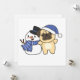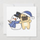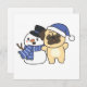 Gå med snögubbe på vintern för jul - snögubbe för vinter och jul. En vinter hälsning under kallet för helgdagarna. Julpug med snögubbe.