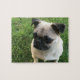 Äkta marionettdockan sitta på gräs, tittar till sidan på mittfoto som lämnar utrymme för anpassningsbar med din egen text.