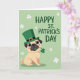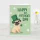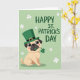 This greeting card features a sweet illustrated pug with creamy fawn fur, looking forward with wide, tender eyes and a faint rosy blush that feels like a friendly little crush. An emerald green top hat sits slightly tilted on its head, finished with a gold buckle that catches the light. A small shamrock rests gently in the pug’s mouth, as if it’s offering a lucky kiss to someone special 💚. The background is a soft, light green wash that suggests a calm spring meadow. Small white shamrocks drift across the scene like light confetti, adding a festive touch without crowding the pup. The words “HAPPY ST. PATRICK’S DAY” appear in dark green near the lower portion of the design in a thick, easy-to-read style. The hat’s deep green, the gold buckle, and the scattered white shamrocks stand out clearly against the pale green backdrop ☘️.
