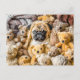 pug surrounded by numerous plush teddy bears, looking content among the soft toys.