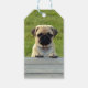 Ett foto från porträtt av en puggvalp som piper över ett pickniskt bord.