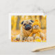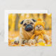 pug with a plush toy in an autumn forest, highlighting cozy companionship amidst fall foliage