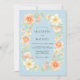 Denna design har en lugn pulverblå bakgrund prydd med ett frodigt arrangemang av akvarellblommor. Ömtåliga persikorösa rosor och aprikosblommor är parade med blekgula vilda blommor och mjuka gröna blad. Den övergripande estetiken frammanar en romantisk vårstämning, perfekt för en graciös utomhusceremoni eller en eterisk morgoncermoni.