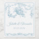Tillsätt en raffinerad fransk touch på ditt bröllopsbord med denna eleganta etikett i Toile de Jouy-stil i en mjuk pudrig blå färgskala. Inspirerad av klassiska franska gravyrer från 1700-talet har designen en utsmyckad blomsterformad ram och en illustration av en ömtålig hängande blomsterkorg, vilket skapar en tidlös och romantisk estetik.
