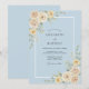 Denna design har en mjuk pulverblå bakgrund prydd med ömtåliga akvarellrosor i nyanser av elfenben och blek kräm. Frodiga salvia gröna blad och eukalyptus kvistar accentuerar hörnen och skapar en fridfull och romantisk stämning. Den luftiga estetiken är perfekt för ett elegant vår- eller sommarfirande med fokus på klassisk botanisk skönhet.