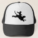 En svart silhouette av en cowboy som rider en sparka bakut puma.