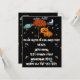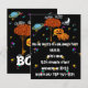 Halloween-inbjudan med svart himmel, halvmåne, färgrik Saturnus, moln och massor av fler färgglada stjärnor. Söt pumpafamilj som står bredvid ett träd med orange höstlöv och en stor BOO! Med ögon ovanpå bokstäverna som inbjuder dig till en ganska inte alltför skrämmande Halloween-skördefest. Perfekt för kyrkans Halloween-fest också!