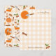 Handritade illustrationer av pumpa paj, pumpor, kanelpinnar och höstbladillustrationer på en rutig gingham bakgrund. En vacker design perfekt för höst hemdekor, tackgivningsdekor och presenter. En söt pumpa paj design med orange och bruna färgtoner.