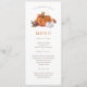 Dessa snygga och stilrena höstpumpa thanksgiving middagsmeny har vackra akvarell brända orange och vita pumpor och höstblommor med ett orange och vitt buffelmönster på baksidan.