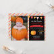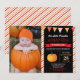 Pumpafödelsedagsinbjudan med anpassad bild. Liten pumpa höst födelsedagsinbjudan. 1:a Första födelsedagen. Orange och röda ränder, skrivtavla bakgrund. För ytterligare anpassning, klicka på "Anpassa"-knappen och använd vårt designverktyg för att ändra denna mall.