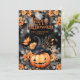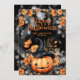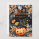 Happy halloween-kort med en leende pumpa och orange blommor framför ett stort spindelnät. Anpassa det här Halloween-kortet enkelt med din familj namn och text.