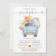 Inbjudan innehåller en blå lastbil-pumpor. Den här designen är perfekt för en falltemerad babydusch.