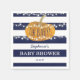 Pumpkin-dockor för babyduschar med chic av blå och vit chic, strimlad bakgrund, ljus för snörvning, en pumpa och en personlig textmall.