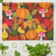 Snyggt Pumpa med släkt kökshandduk. Färgämnen i höst löv, akorner, pumpor, bär och toadstooler har en djup grått-bakgrund. Modern fall skördehandduk. Du kan anpassa och ändra bakgrunden färg till spelar ingen roll kostym till din smak.