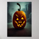 En orange pumpa med en skrämmande ansikte som färdas längs gatan på Halloween. Det här är en AI-skapad konst.