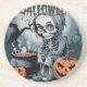 En scen Halloween med ett skelett inuti en pumpa, omgiven av inslag.