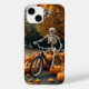Ett viskigt skelett som kör en cykel fylld med pumpor och höst löv. Underbar Halloween-design med roligt säsong vibes.