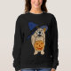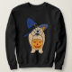 Whimsical cartoon dog in a wide wizard hat carries a glowing jack-o'-lantern. Bold lines, warm autumn colours, Halloween vibe, ideal for playful apparel and festive gifts.