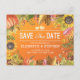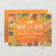 Spara dokumentkortsmallarna för datumbröllopsinbjudan - Elegantens Löv för höstskarta, pumpor och solblommor vattenfärgsblommor på Orangens övertoningsbakgrund. En Perfekt för din stora dag! Alla textstorlekar i Stil, Färg kan anpassas efter dina behov.