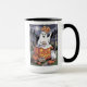 Pumpor för försäljning och koffeinvärdvin med katt V3 Mugg. Ett vitt lakan-spöke sitter på en gigantisk pumpa i regnet och sjunker kaffe under en brun pumpa löv. Vid sidan av en skylt "Pumpkins for Sale", står mr Cat. Affärsverksamheten är bokstavligt talat långsam, men de är åtminstone kaffets hett!