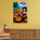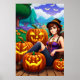 Ett ungt dam med kort hår och hat sitta bland många läskiga orange pumpor och två ögon, näsa och ett läskigt leende. Det här är en AI-skapad konst. Halloween-temakonst