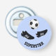 Lägg till en egen bildtext eller en namn för att anpassa den här flaska-öppnaren, som är designad för alla fotbollsspelare eller fläkt. Standardvärdet är "SUPERSTAR". Konstruktionen har en fotboll och två fotstövlar på en blek blå bakgrund.