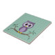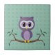 White Ceramic Tile har en söt lila tecknad uggla i en extremitet med en grönt polka dot mönster bakgrund. Anpassade.