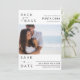 Vår Punta Cana-destinationsbacheminnet Spara datumkortet med fotot kommer inte bara att meddela din speciella dag utan även transportera dina gäster till det andningsmål där din kärlek-berättelse kommer att uppkomma. Ställ in scenen för ett minnesvärt firande som de kommer att bli glada över att vara en del av. Beställ din idag och börja räkna ner dagarna tills ditt romantiska badbröllop! Dessa kort kan användas för valfri plats genom att anpassa texten med hjälp av mallen.